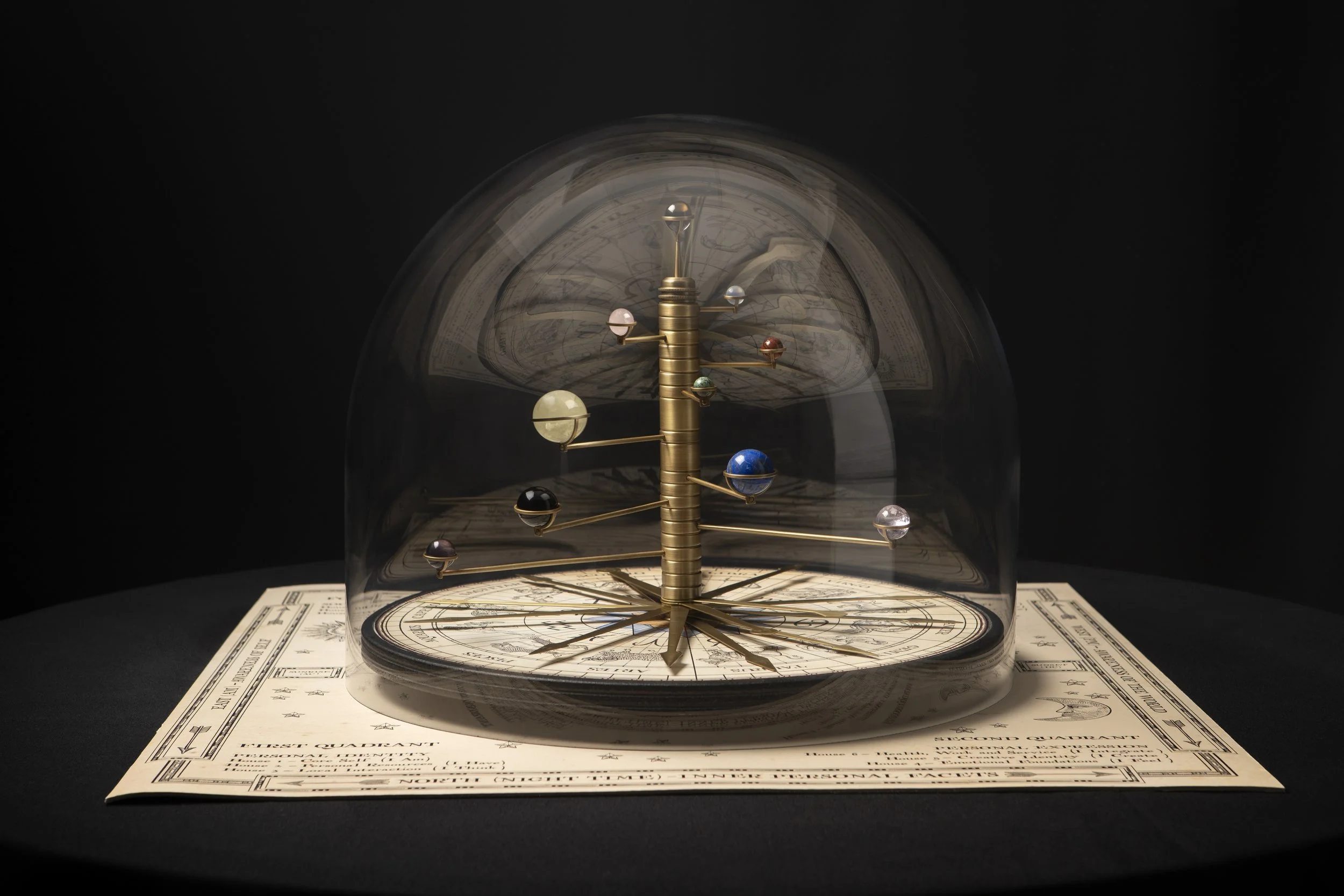 These contain crystals that represent the Sun, Moon and planets, and rotate around a stationary Earth crystal at the top.
